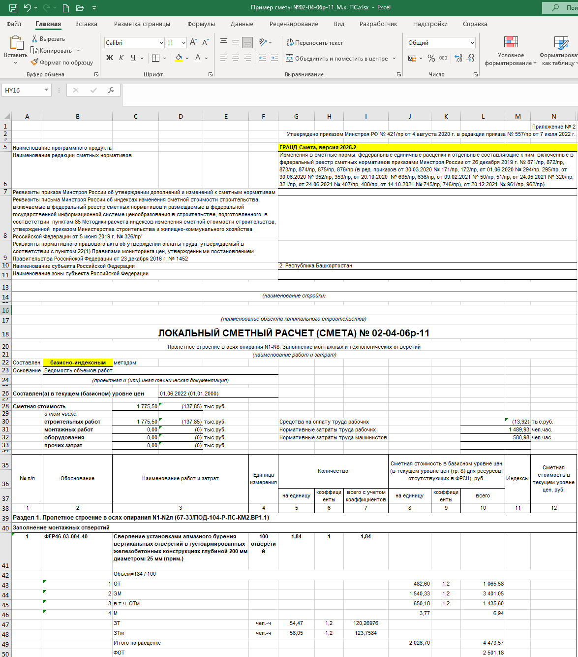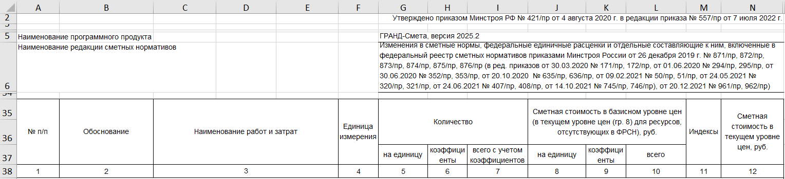 - Точно совместим (протестирован) на сметах программы ГРАНД-Смета, версия 2025.2, вот с такими столбцами и заголовками шапки сметы: