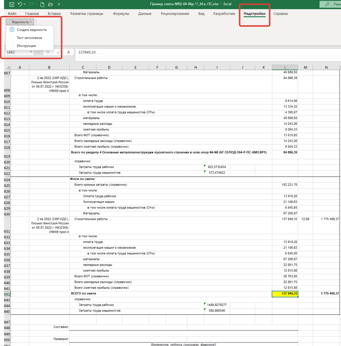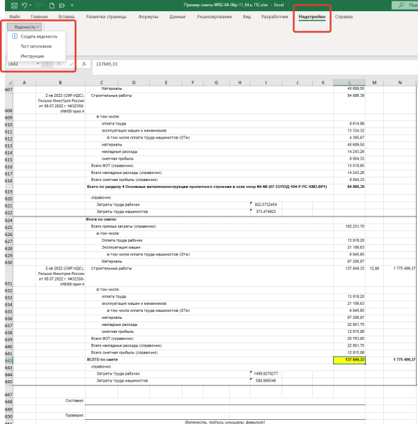 Скачайте бесплатную ТЕСТОВУЮ версию программы, которая обрабатывает первые 10 строк сметы: Надстройка Cмета (БИМ-ГрандСмета-12 граф)-Ведомость v2.5_Тест_10 строк