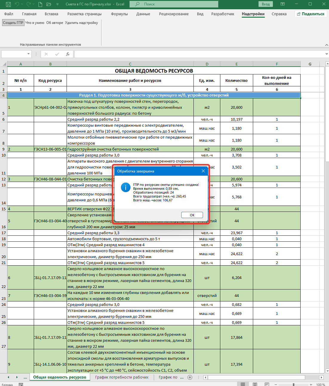Макрос (Надстройка) «Ресурсы по смете» для Excel